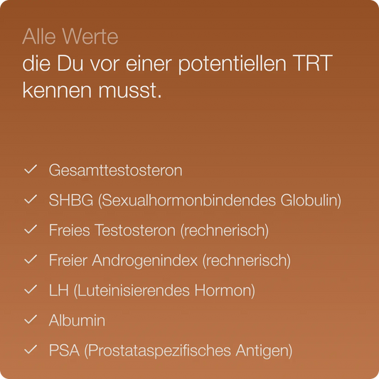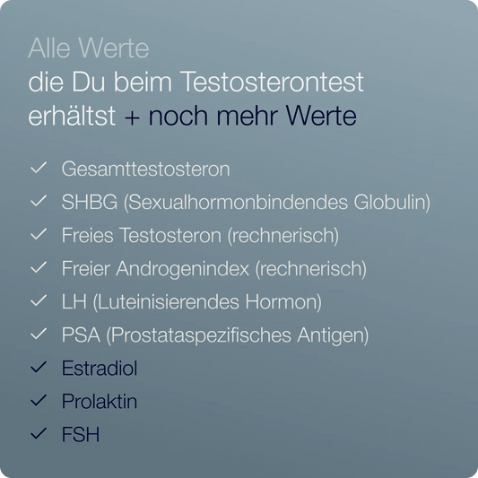 Gesamt- und freies Testosteron, SHBG, Albumin, PSA, LH, FSH, Prolaktin, Östrogen